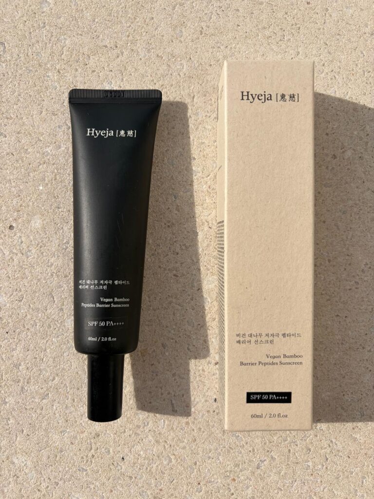 A black tube. Hyeja is Korean — deeply invested in the quality of what goes in. Squalane, peptides, ginseng — a milk-like cream. SPF 50, but also skincare.